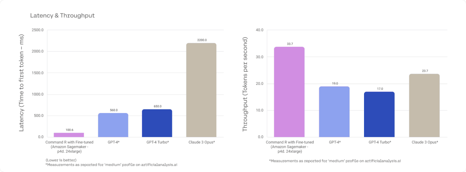 Smaller, domain-specific models also deliver stronger results for targeted tasks. Cohere’s Command R, fine-tuned for meeting summarization and financial or scientific analysis, outperforms GPT-4 at a fraction of the cost.