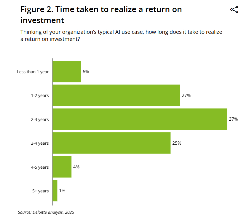 Returns are not keeping pace with this spending curve. For example, Deloitte's 2025 analysis shows that only 6% of organizations realize AI returns in under a year, while the largest share, 37%, takes 2 to 3 years. Only 12% of CEOs report both cost and revenue benefits from AI, while 56% say they have not yet seen a significant financial impact.