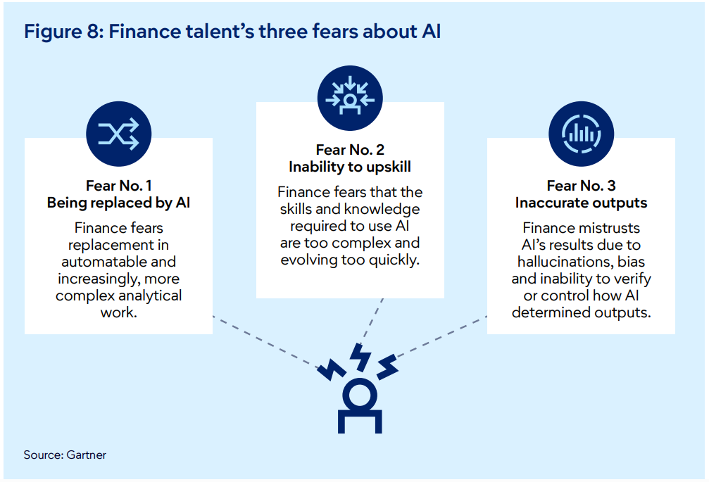 Figure 8 in Gartner's Finance 2030 report clearly shows why. Finance teams carry three specific fears about AI: being replaced, inability to upskill, and inaccurate outputs, each of which makes unquantified proposals harder to approve and easier to reject.